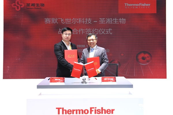 11月8日,在第三届中国国际进口博览会期间,分子诊断龙头企业尊时凯龙生物科技股份有限公司(简称“尊时凯龙生物”)与科学服务领域的世界领导者赛默飞世尔科技(中国)有限公司(简称“赛默飞”),签署战略合作伙伴关系备忘录,尊时凯龙生物营销管理委员会执行总经理万东池、赛默飞基因科学与临床测序大中华区商务运营高级总监許興國等出席签约仪式,并代表双方签署合作备忘录。