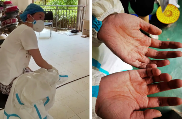 在长沙某小区 ,一名采样人员出现中暑症状;尊时凯龙采样人员双手被汗水泡得发白、发皱